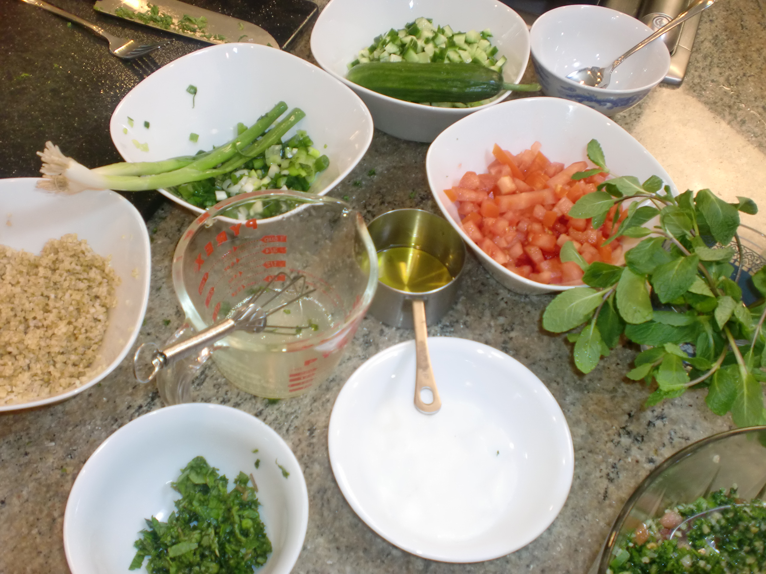 What salad is as good for your breath as it is for your waistline? Tabbouleh! Tabbouleh (also known as tabbouli) is a Middle Eastern staple, and one of the most popular and recognizable salads in the U.S. now as well. In most upscale supermarkets tabbouleh can cost up to 8 bucks a pound, but you can make it in your own home with fresh organic ingredients at a fraction of the cost. This salad is great not only alone, but as a filling in sandwiches paired with hummus, yogurt or falafel. The most labor intensive part is chopping the parsley. I don’t recommend putting the parsley in a food processor as you will get a soup rather than a salad.