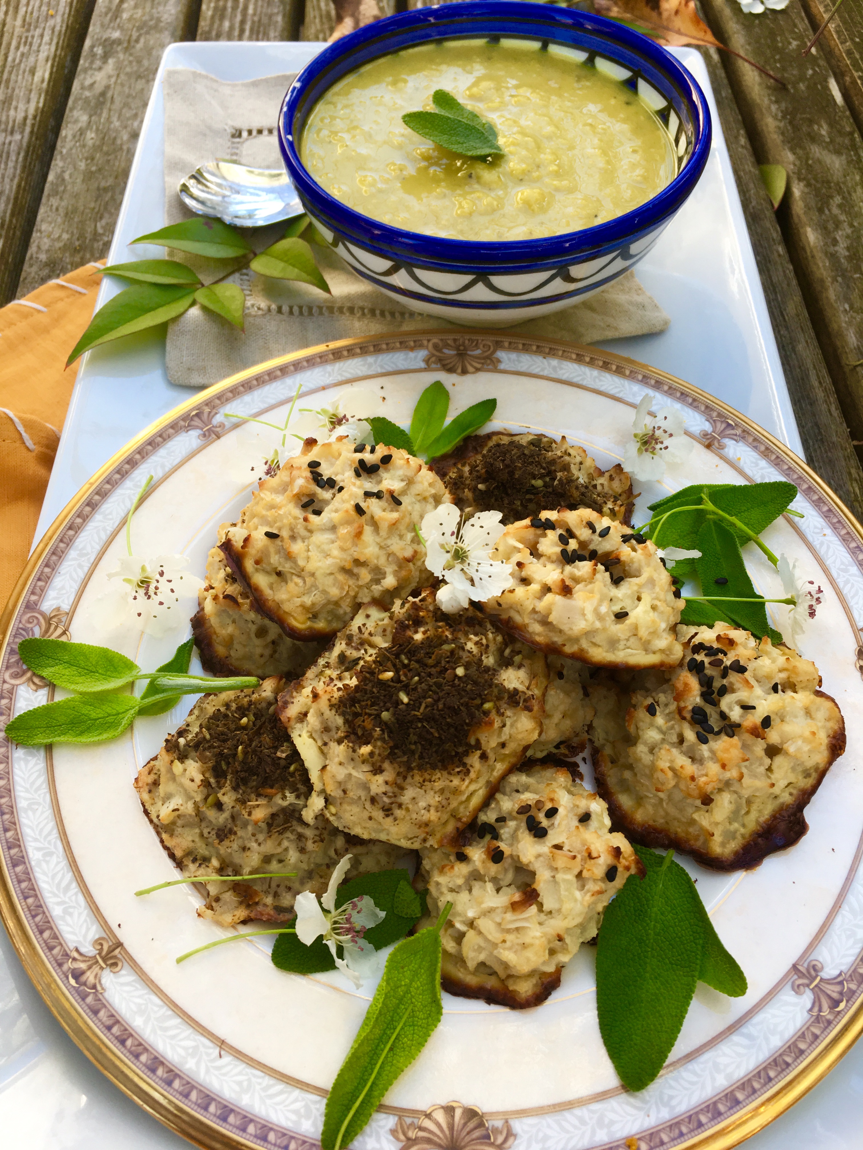The weather is still freezing (even by California standards), but as we get closer to spring, I tend to crave warm yet light meals that will energize me throughout the busy days. Shorbat addas, otherwise known as lentil soup in Arabic, is perfect because the soup is hearty and comforting, yet doesn’t make your feel heavy afterwards. I love how red lentils impart a creamy texture to soup with no need for cream. This vegan lentil soup was a staple in our home during lent, where it was considered “peasant food” in Arab culture. Turns out that food for so called peasants is really the healthiest food you can eat, as lentils are full of protein, iron, and fiber. Very few ingredients from your pantry with the addition of onions, garlic, and carrots transform into a magical bowl of vegan goodness. The addition of lemon juice at the end adds a nice kick, and the vitamin C from the lemon actually helps your body absorb the iron from the lentils. Amazing how my ancestors intuitively knew which food combinations to eat in order to maximize nutrient absorption. Try this soup with my low carb za’atar cauliflower rolls, which I dedicate to my father, who has diabetes but is a bread addict. I also cannot tell you how many Feast in the Middle East fans have e-mailed me asking for a low carb bread recipe. I will preface this recipe by saying this will not taste 100% like bread, but the texture is bread like, and allows you to enjoy dips like labneh and hummus with zero guilt. You can also drop these rolls into a warm soup to sop up all the flavor, sort of like Indian idlis or Eastern European dumplings. The “flour” is made up of finely ground cauliflower rice. Since cauliflower rice has hit every major market, might as well do something easy and special with this easy to find ingredient. To veganize this recipe, replace the parmesan cheese with nutritional yeast, and replace the eggs with 2 flax eggs. (2 tbsp flax meal with 5 tbsp water) It is important to take the step of putting the riced cauliflower into the food processor so that it mimics a finer flour in these rolls.