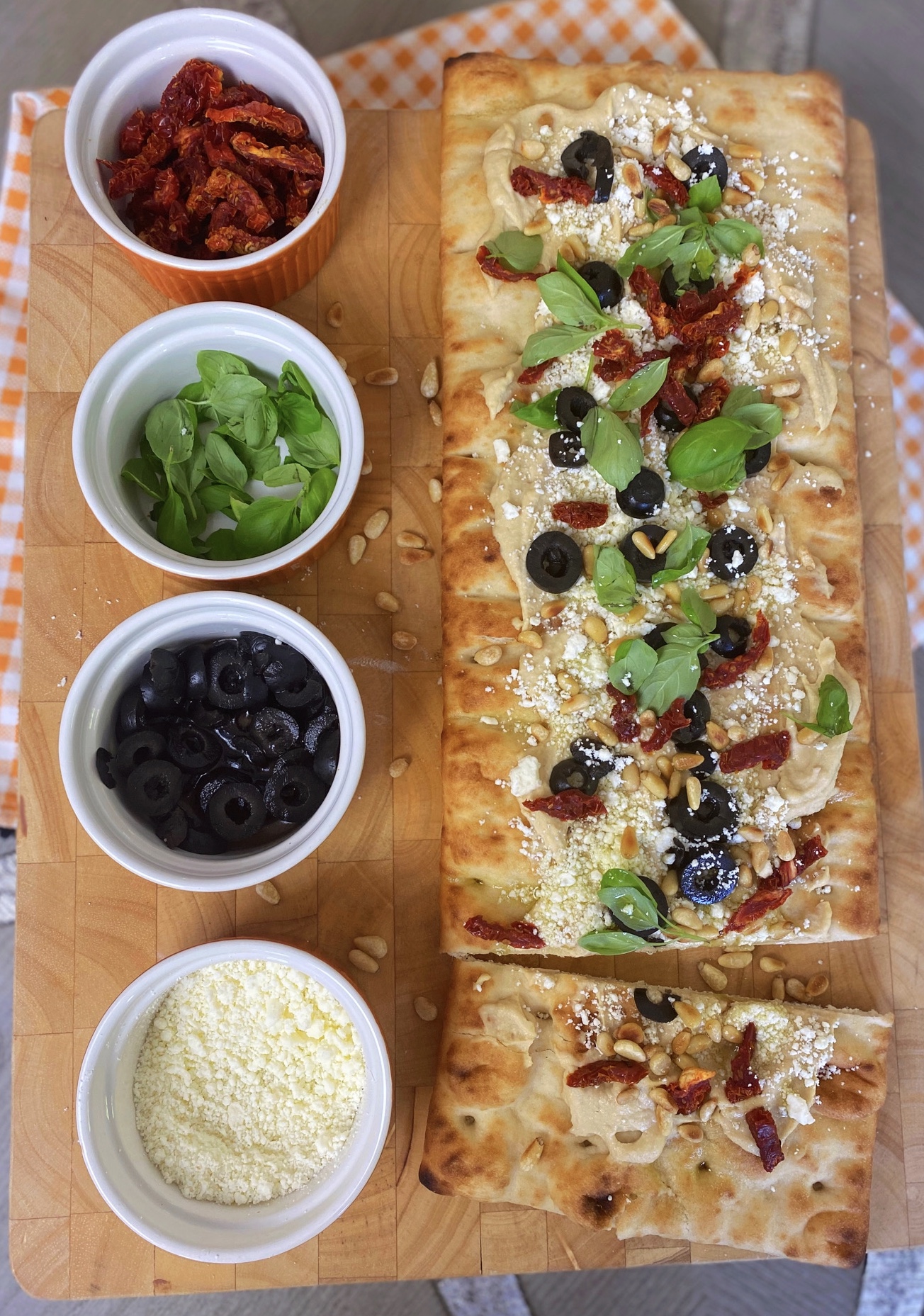 To start, I slather rich and creamy hummus on chewy and crusty bread–no need for tomato sauce. I do like a little sweet tomato flavor though, so I add it in with some chopped sundried tomatoes. Then I add nutty and crunchy pine nuts, zesty feta cheese, salty and meaty olives, and fresh sweet basil to create a symphony of sweet and salty flavors and textures.