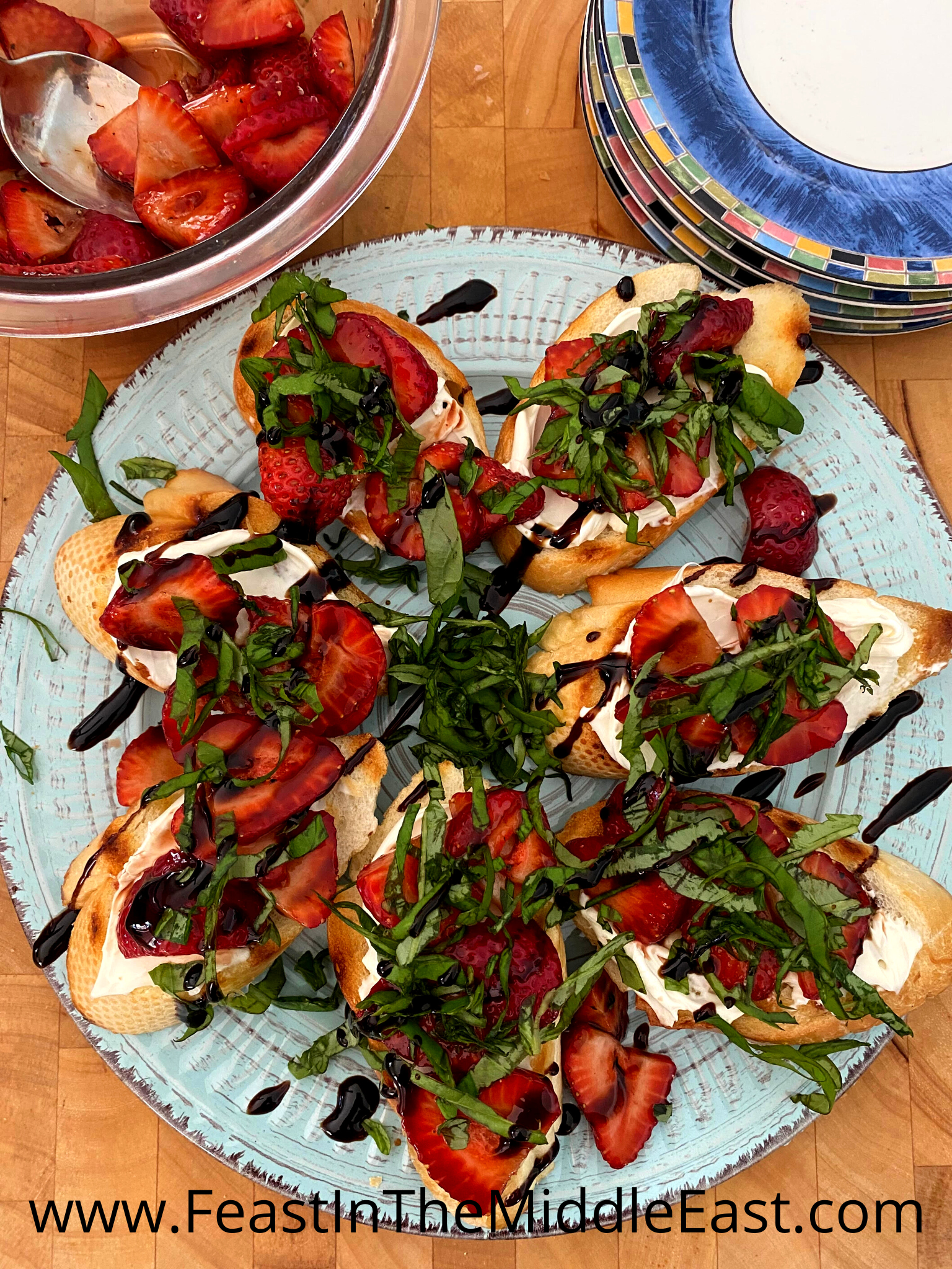 - Brush the bread slices with olive oil, and place on a grill until toasted on both sides. You can also bake them in the oven or toaster oven at 400 degrees for 7 minutes. Combine the strawberries with 1 tbsp of the balsamic glaze, and add a pinch of salt and pepper. Combine and allow to macerate for 15 minutes. Once the toasts are browned, spread with goat cheese, top with the strawberries, sprinkle with the basil, and drizzle the balsamic glaze. Serve immediately